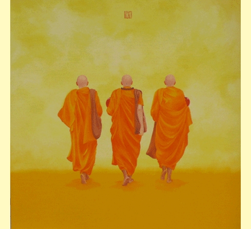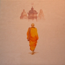 “Inspired by his travels to Buddhist cultures, Phuoc depicts the devotion and discipline of Buddhist monks in a very appealing artistic style. Phuoc’s art focusses on the iconic image of a monk or a group of monks, viewed from the back, traveling onwards in a purposeful journey (emphasis mine). The backgrounds of his works vary from pagodas of temples to tree tops and even deep hue of reddish orange.”