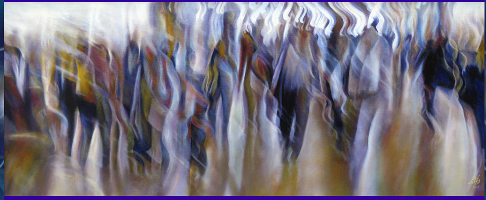 The painting could also be viewed metaphorically as “The End of the Rat Race” – the rigid competitive structure of mainstream society – as we move forward with the flow of Community Spirit and become Human(e) Beings again. Seen that way, the figures in the painting represent the essential Spirit of Humanity, harmoniously interwoven in the shared enterprise of conscious evolution.”